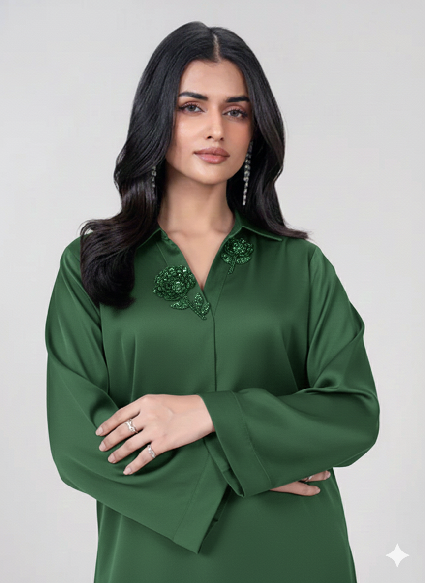 Solid top with collared neck and embellished brooch detail